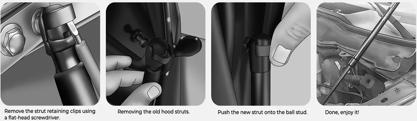 We need hood struts to safely hold the hood open while servicing the engine. They allow smooth lifting without sudden drops, preventing injuries and damage. Hood struts also reduce stress on hinges compared to manual props. During oil checks, fluid inspections, or repairs, they free both hands, improving safety, comfort, and working efficiency.